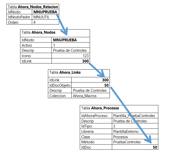 Ejemplo Veamos la estructura necesaria para disponer un nodo MNUPRUEBA que cuelga del menú MNUUTIL. El nodo contiene un Link y el Link apunta al proceso Prueba_Controles. El proceso Prueba_Controles hace referencia a una función definida en la clase Procesos. Cuando hagamos clic en el nodo del árbol se ejecutará nuestra función PruebaControles.
