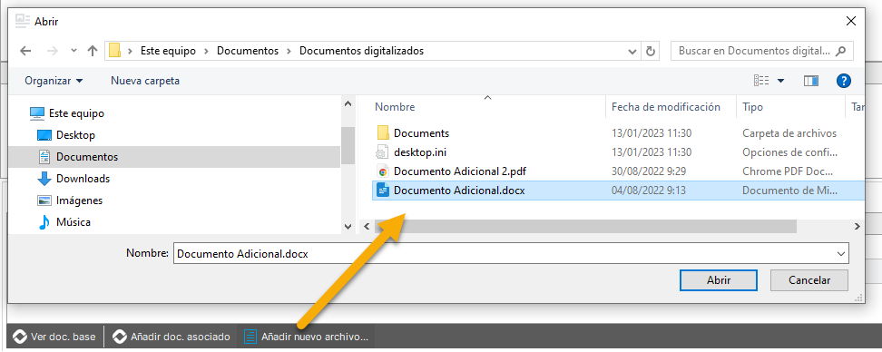 La segunda opción permite asociar un nuevo documento al objeto además de seleccionarlo para su envío. Es una forma sencilla y rápida de incluir documentación asociada previo al envío y que esta quede asociada al objeto en su gestión documental.