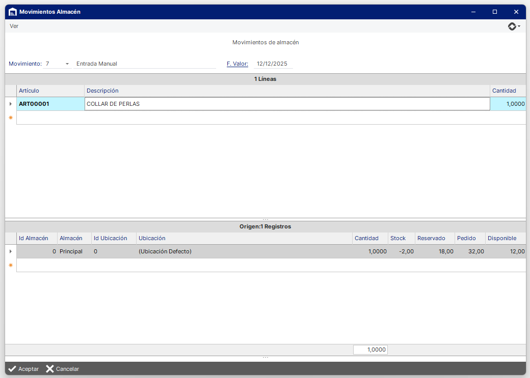 En el momento que aceptásemos, el movimiento se registraría y modificaría el stock del artículo.