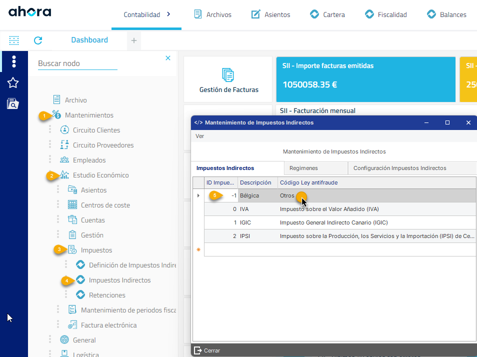 - 1. Dar de alta nuevo impuesto Indirecto en la tabla de mantenimientos