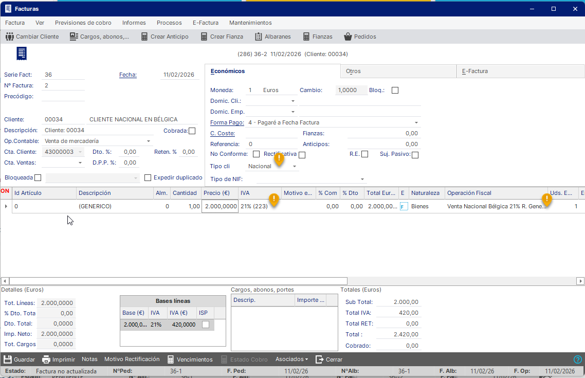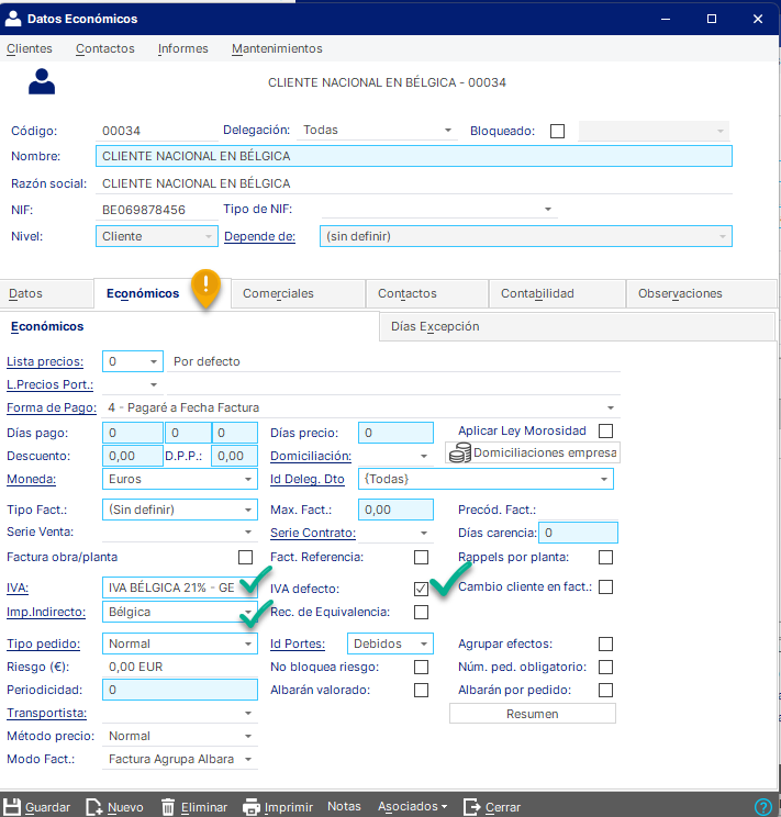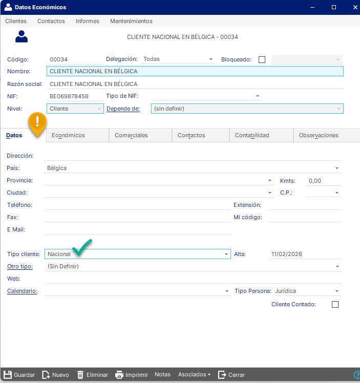 Para trabajar con este tipo de operaciones y tener reflejado el Impuesto tanto en los apuntes como en el LIVA, lo que tenemos que hacer es definir este tipo de clientes como nacionales puesto que, si indicamos que el cliente es comunitario, el programa por la operativa estándar, no le asignará el IVA (es el cliente que se autorepercute el impuesto en destino en una venta intracomunitaria) y tampoco habrá un apunte de impuesto al actualizar la factura.