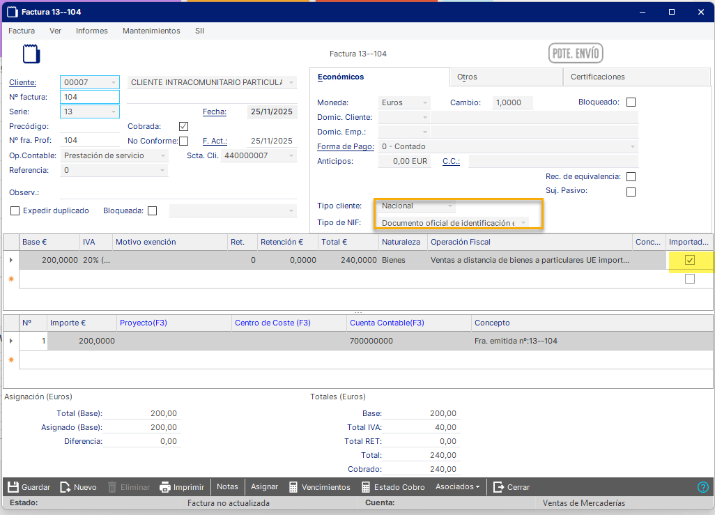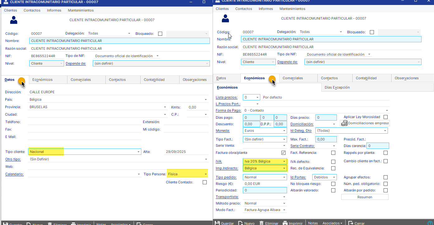 Recordemos que para poder marcar este check, el cliente debe ser nacional, el país informado debe ser comunitario y debe ser persona física.