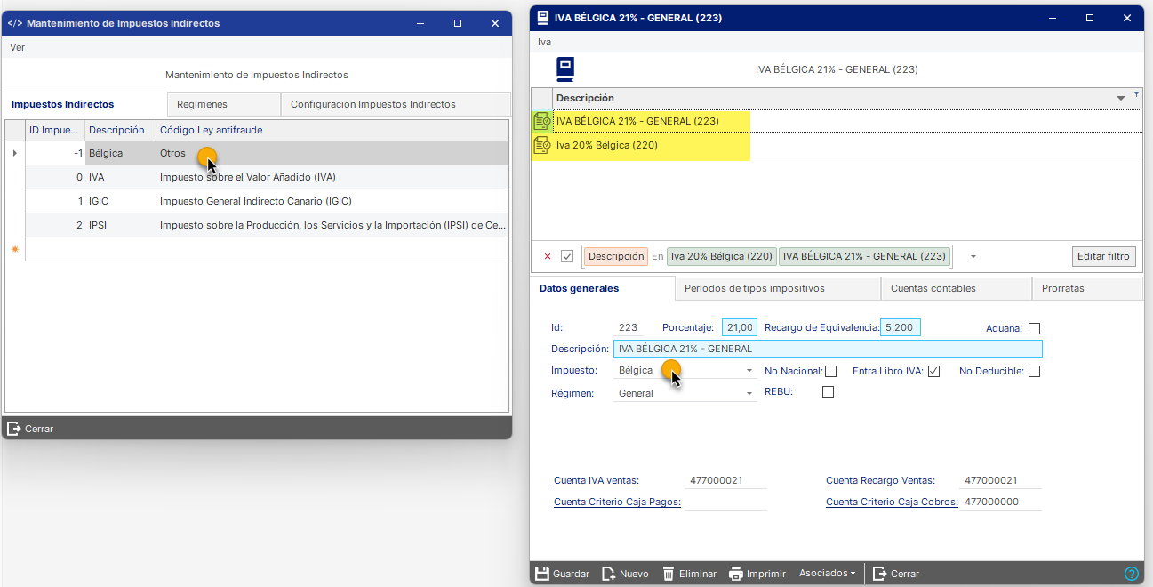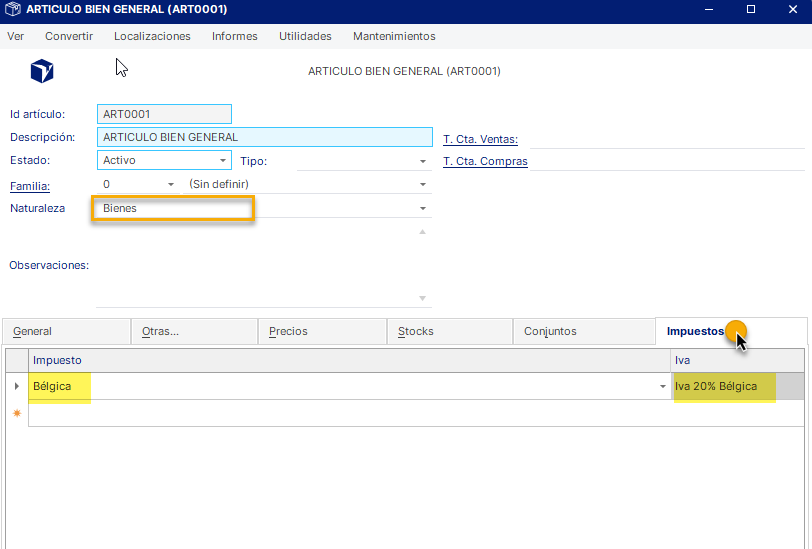 Para cada artículo hay que definir sus impuestos indirectos por defecto que se le aplicará para cada uno de los que hemos creado como impuestos comunitarios.