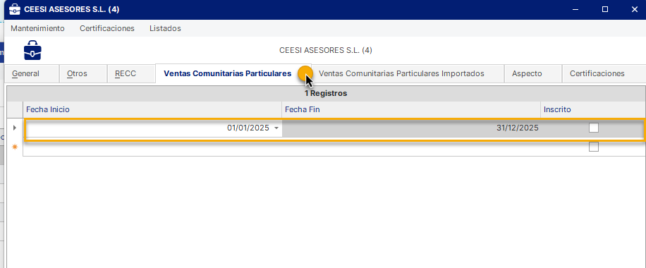 Para indicar al programa que en las ventas a particulares comunitarios de bienes no importados y servicios tenemos que empezar a aplicar el impuesto del país del cliente, debemos generar un registro en la pestaña de la empresa que se denomina “Ventas Comunitarias Particulares (OSS)”, con fecha inicio y fin.
