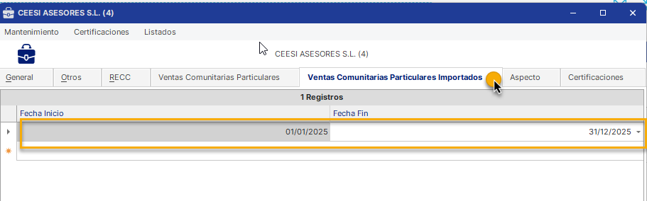 Para indicar al programa que estamos inscritos en la ventanilla única de ventas a particulares comunitarios de bienes importados debemos generar un registro en la pestaña de la empresa que se denomina “Ventas Comunitarias Particulares Importados (IOSS)” con fecha inicio y fin de la inscripción.