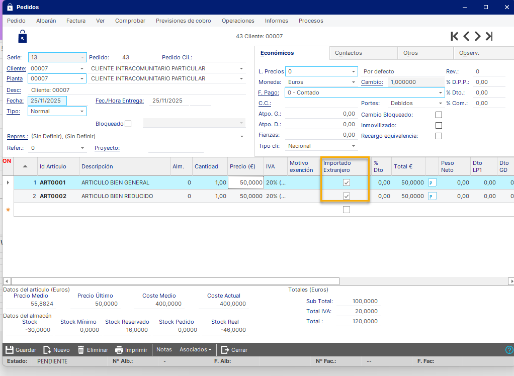 En las líneas de los pedidos/facturas tenemos un check: ImportadoEx: indica que el bien es importado, y se aplica el I.V.A. del país de destino.