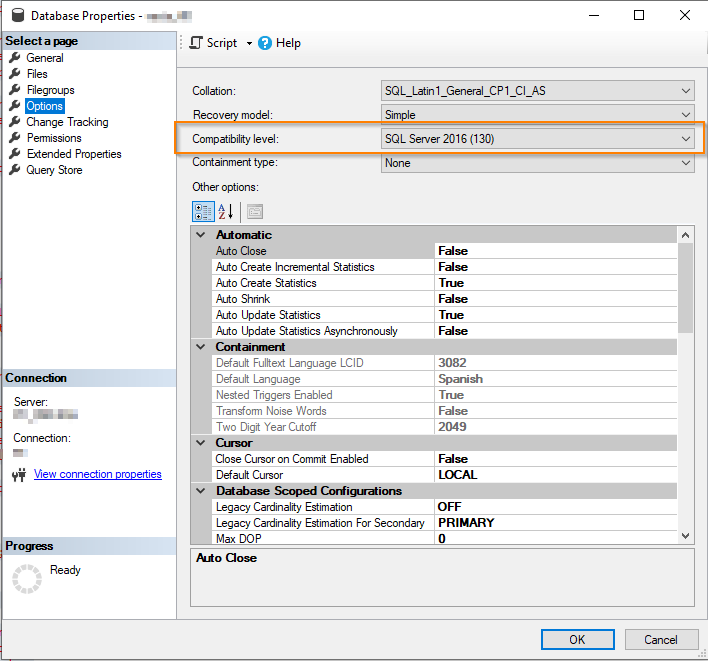 Para poder ejecutar correctamente el script de actualización es imprescindible que el nivel de compatibilidad de la base de datos sea 130 o superior.