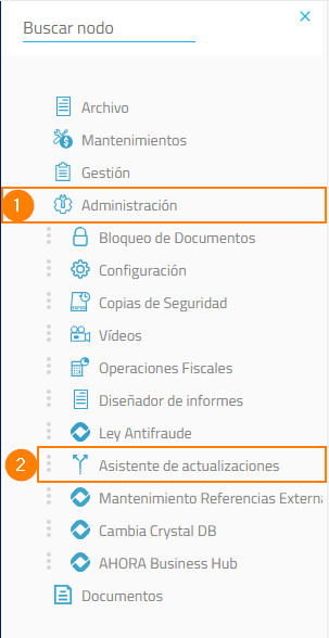 Para acceder a la utilidad, haz uso del menú "Asistente de actualizaciones". Si no lo tienes disponible, es debido a que no está activo o configurado el paso anterior o el nodo por seguridad no está habilitado. Debes ponerte en contacto con el administrador del ERP para que lo active:
