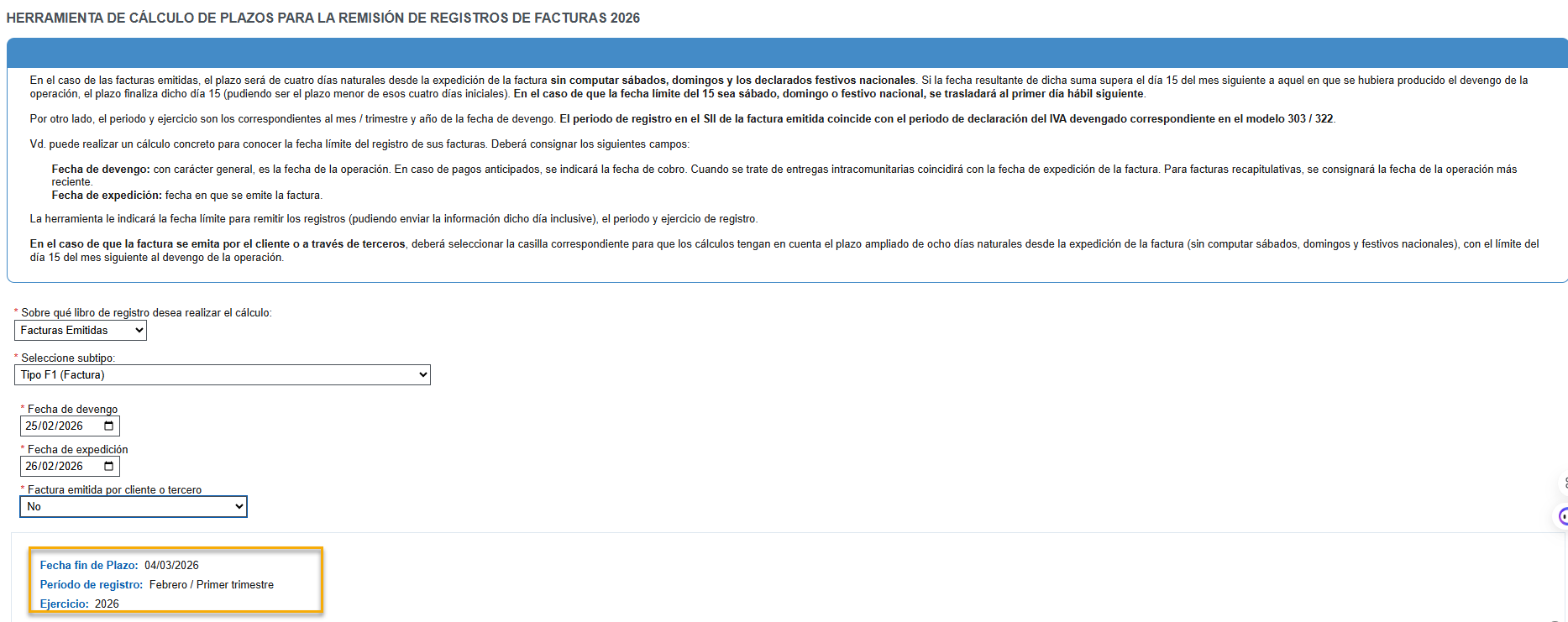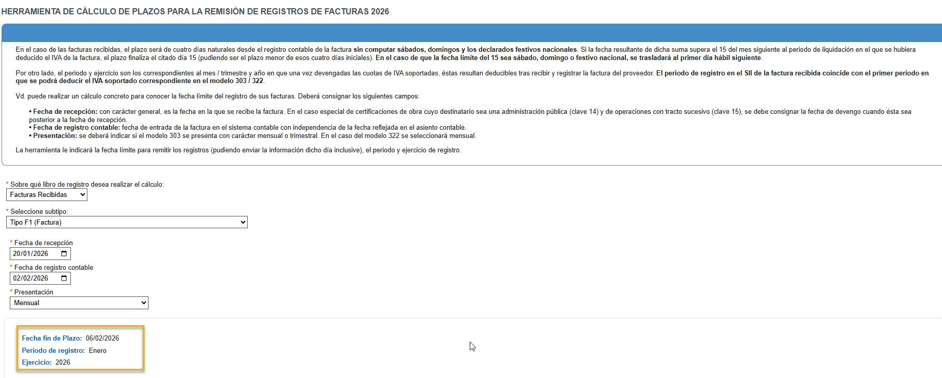 AEAT dispone de una utilidad que indicando las fechas de la factura, determina el periodo, el plazo y el ejercicio: