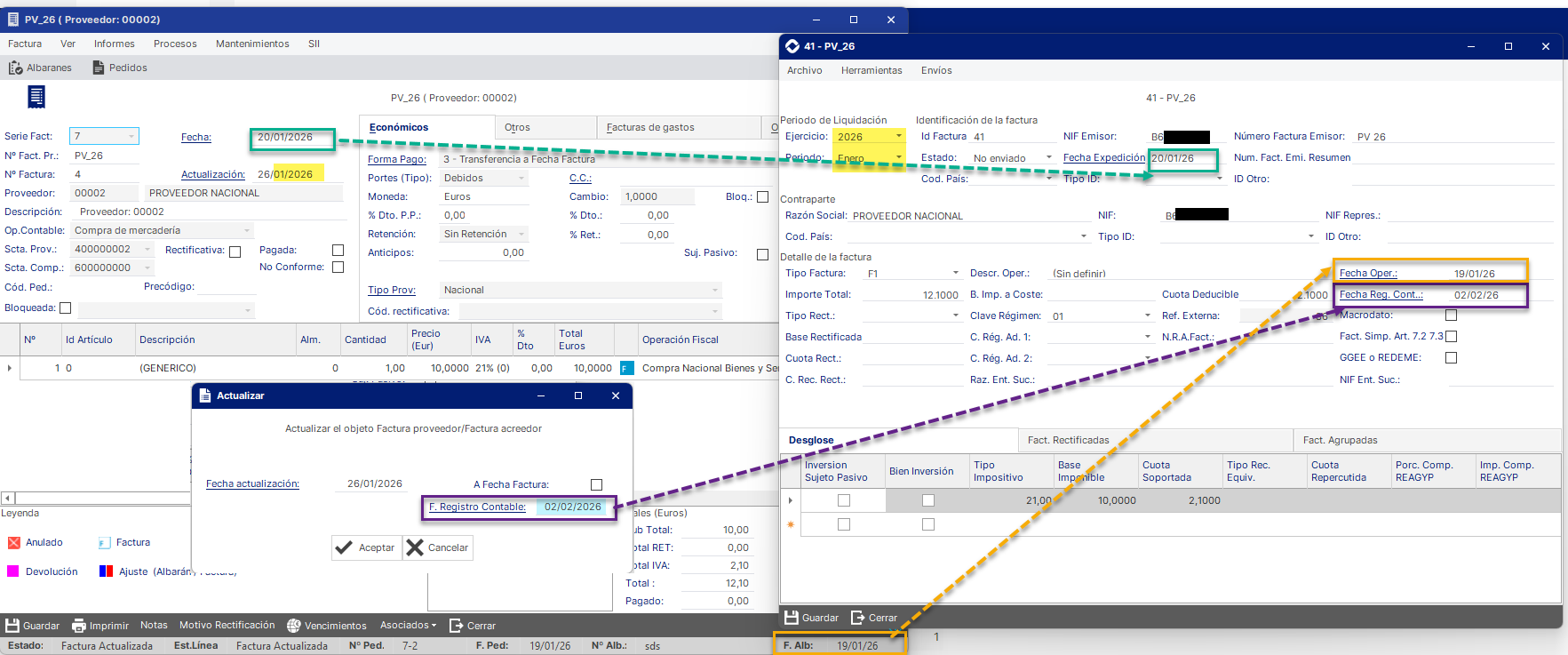NOTA: Por regla general, la fecha de actualización en compras debe ser igual o posterior a la fecha de emisión de la factura, puesto que el IVA sólo es deducible una vez que el proveedor me ha emitido la factura, aunque la operación sea de un periodo anterior. Puede ser distinta a fecha operación, pero dentro del mismo período fiscal que la fecha de recepción.