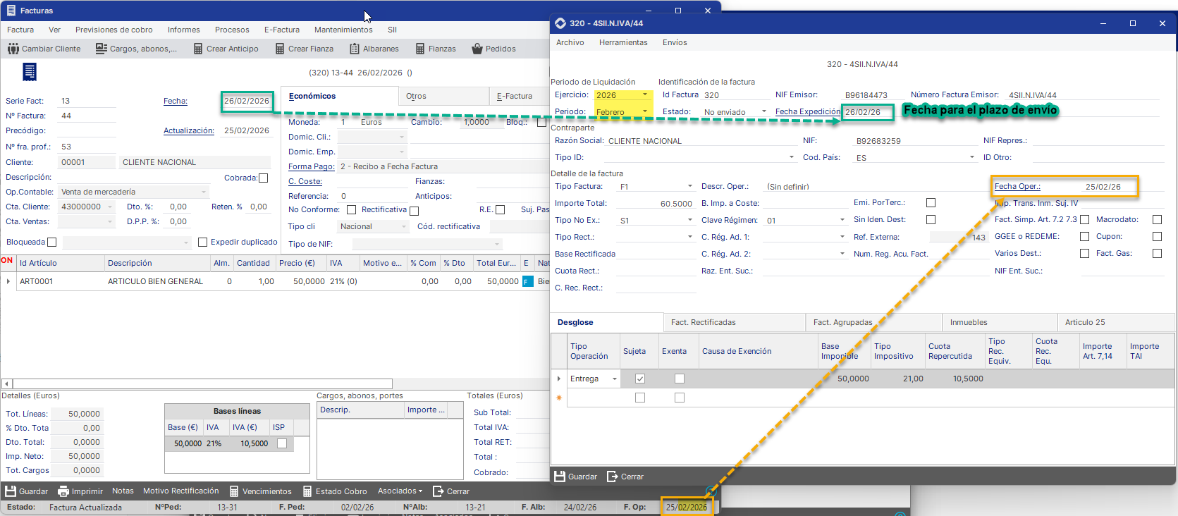 • Fecha actualización: Es la fecha de registro fiscal y contable de la factura, que a su vez es el periodo de devengo de IVA.