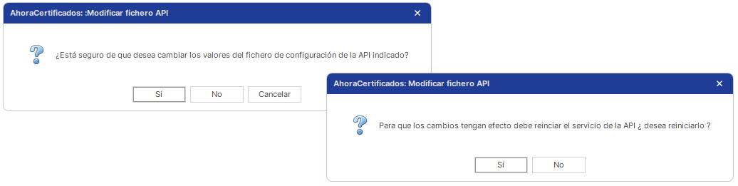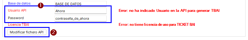 Para subsanar el primer punto, tan solo hay que introducir el nombre del usuario y la contraseña que tiene asignada, pulsar el botón Modificar fichero API, confirmando la modificación del mismo, y aceptar el reinicio de la API (Fig. 4).