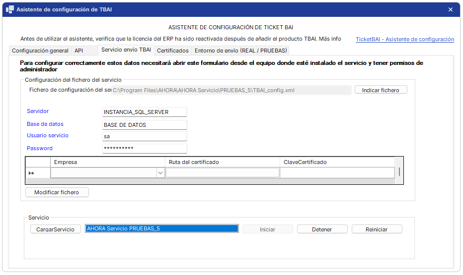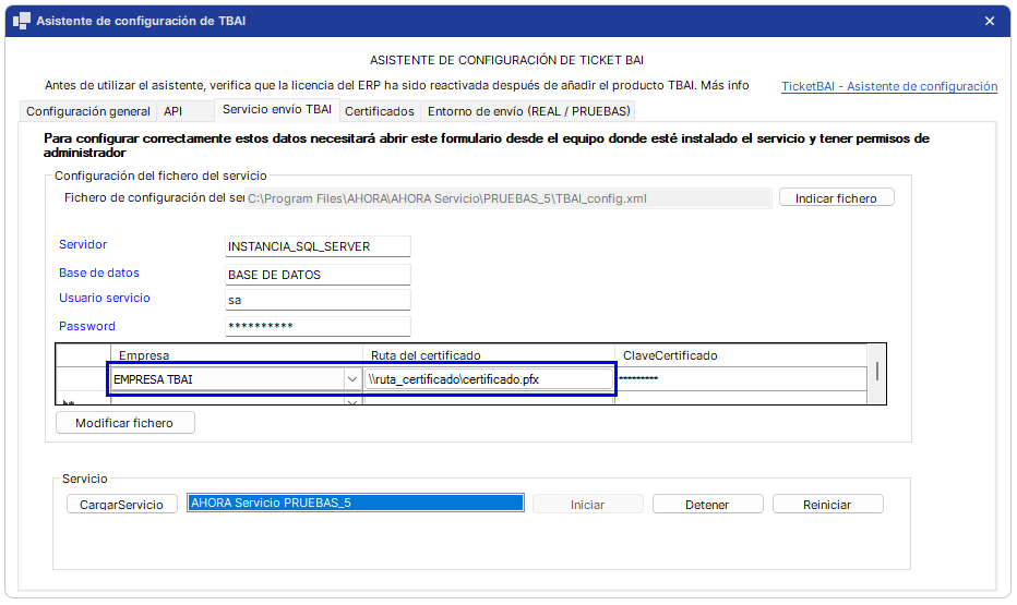 Para realizar esta configuración, seleccionaremos la empresa mediante la lista desplegable asociada y buscaremos el certificado pulsando en el botón Ruta del certificado. Asignándole a continuación la clave correspondiente, quedando la información introducida como podemos ver en la Fig. 7. Tan solo quedaría pulsar Modificar fichero servicio y confirmar el reinicio del mismo.