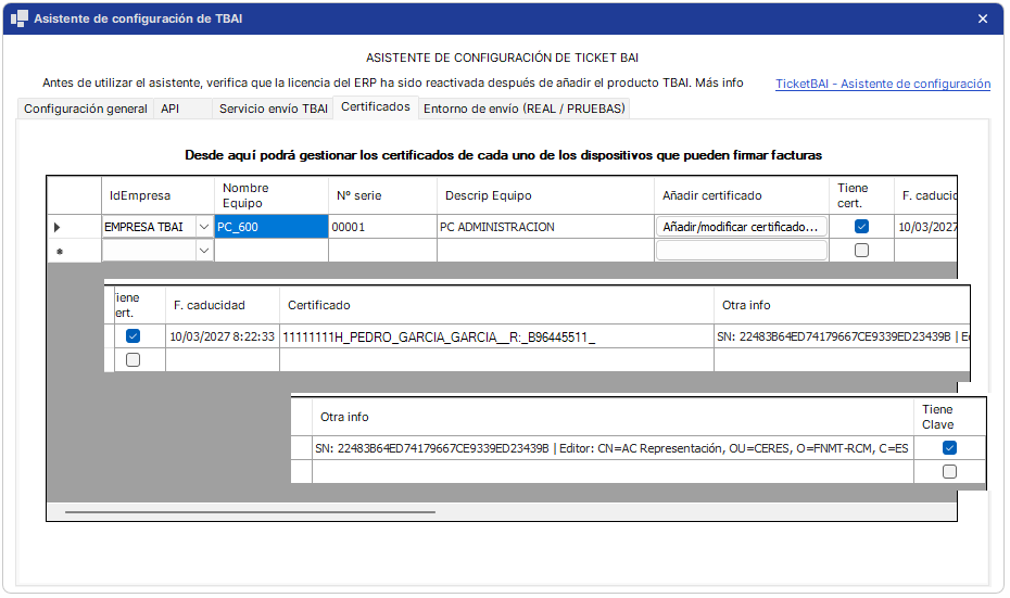 La novedad con este asistente es que, además de no ser necesario ir a cada equipo para configurar el certificado con el que va a trabajar, podemos relacionar un solo equipo con varias empresas y asignarle tantos certificados como empresas tengamos.