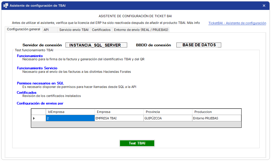En primer lugar, pulsaremos el botón Test TBAI para que el asistente compruebe qué hay configurado correctamente y que es lo que falta por configurar.