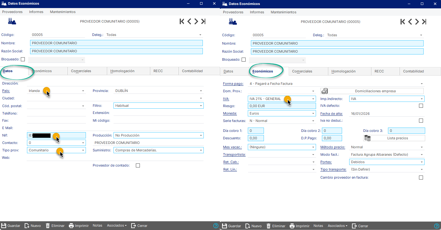 Como datos esenciales que debemos informar en la ficha de nuestros proveedores miembros de la UE son los siguientes: