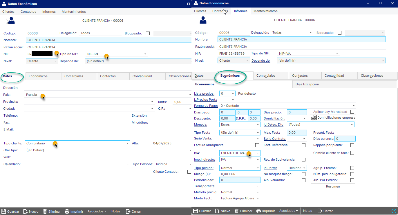 La correcta configuración de los clientes/ proveedores comunitarios (UE) tiene repercusión directa en el cálculo de las operaciones fiscales, su registro en el Libro de IVA, el cálculo de los modelos fiscales (por ejemplo Modelo 303, 349 y 390) y el correcto registro en la certificación de facturas como SII, TBAI, VeriFactu.