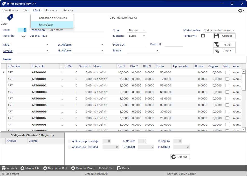 Con la búsqueda del objeto “Precios Clientes” obtenemos las listas de precio de cliente. Abrimos la lista de precios en la que queramos añadir el artículo y lo añadimos desde el menú “Añadir” à “Un artículo”