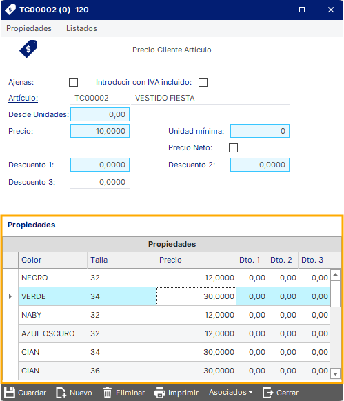 Una vez guardada la cabecera, si el parámetro "PRECIOSPORPROPIEDADES" está activo, aparecerá la grid de propiedades, y podremos generar las combinaciones de talla y color en las que queramos especificar un precio distinto al de la cabecera.