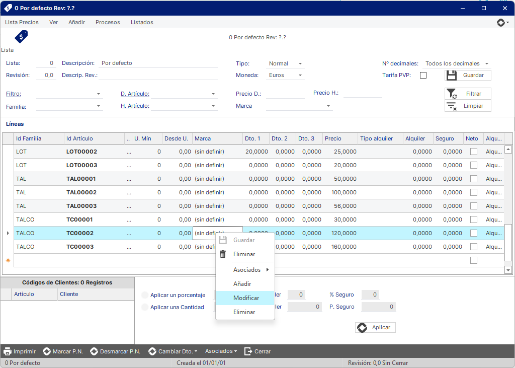 Una vez dados de alta todos los precios, en caso de realizar alguna modificación, se deberá pulsar botón derecho --> modificar sobre la línea de la lista de precios, de manera que abra de nuevo el formulario anterior.