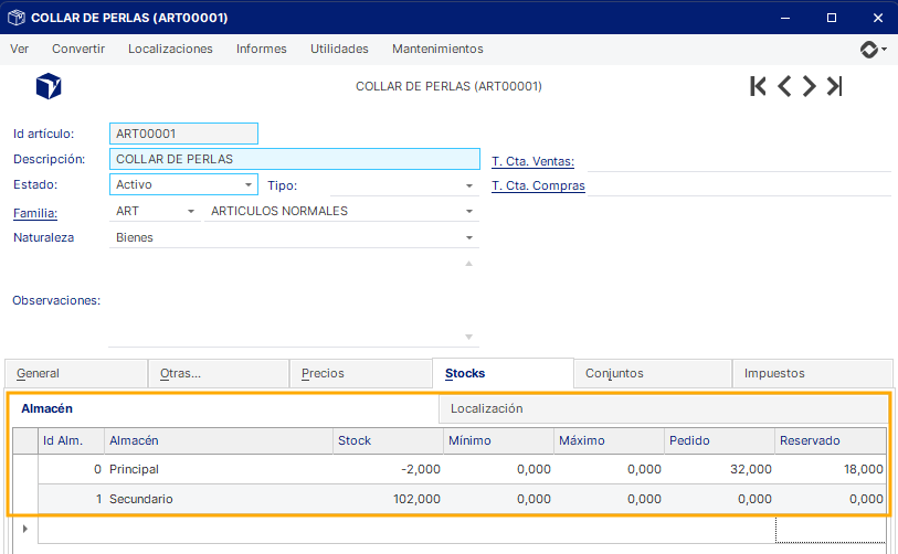 Tendremos la opción de ver y consultar la información del estado del stock desde múltiples formularios. En este ejemplo lo veremos desde la ficha del artículo.