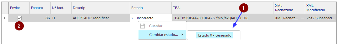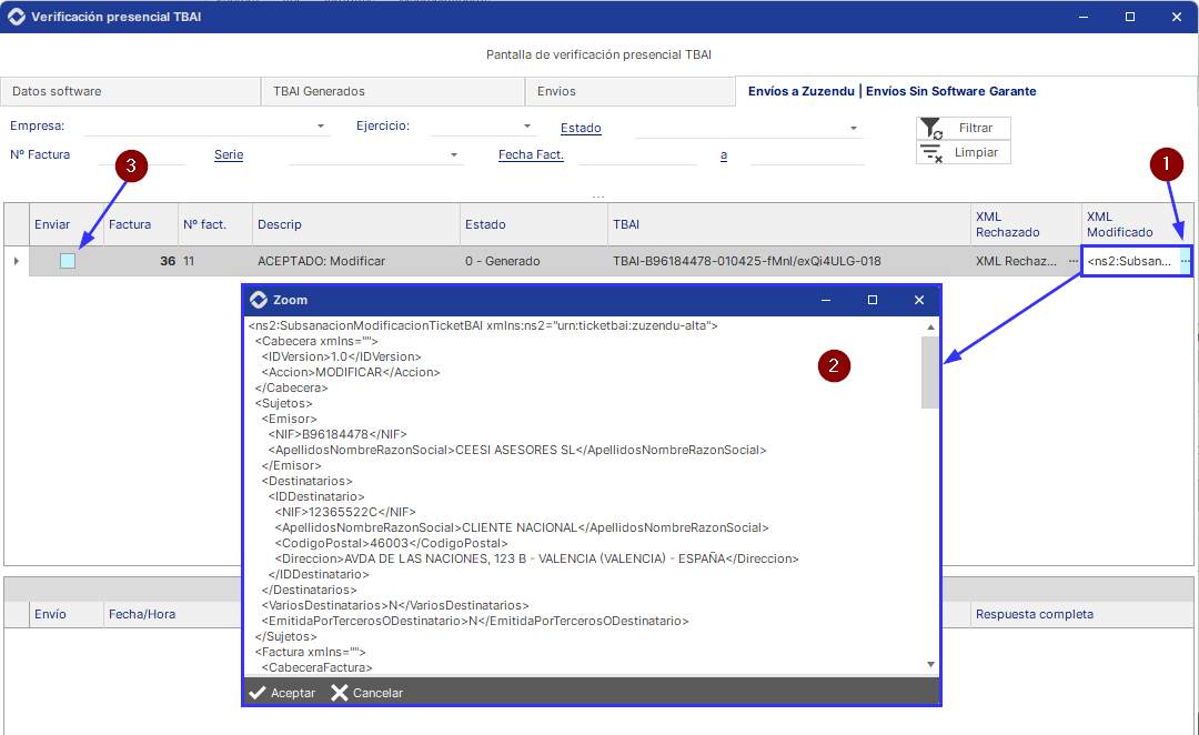 Una vez verificada la modificación y pulsado el botón Aceptar, activaremos el check Enviar (3) y, al cambiar de línea, se realizará el envío del xml rectificado.