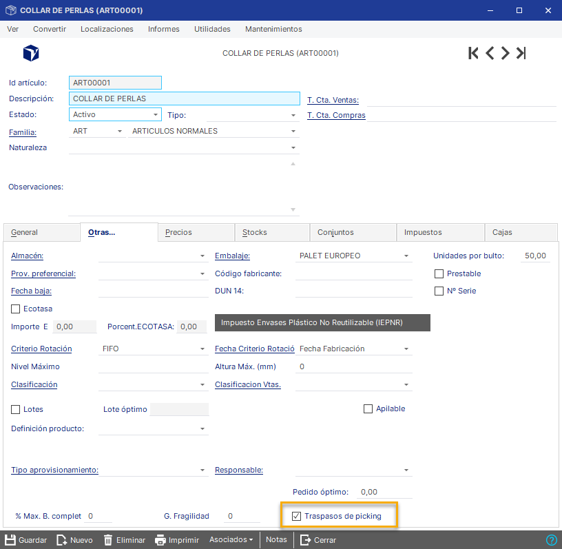 Existen una serie de requisitos previos que se deben de cumplir para poder generar este tipo de trabajos como, por ejemplo, que los artículos estén marcados con el check de "Traspasos de picking".