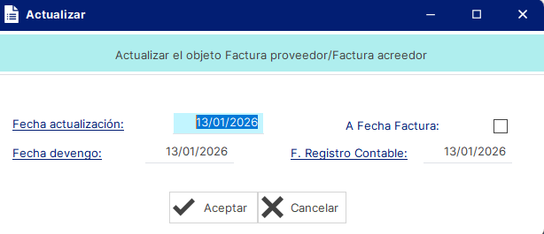 Al habilitar este parámetro, en el momento de actualizar la factura recibida aparece un nuevo campo: Fecha Devengo. Lo que permite: