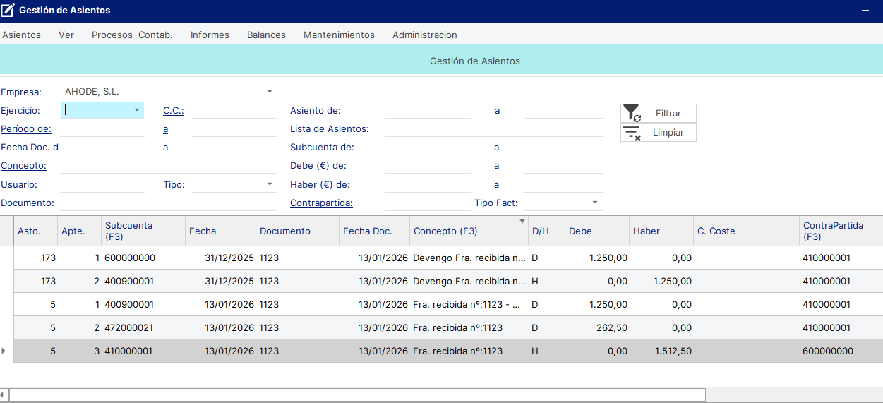Una vez actualizada la factura con las fecha devengo y de registro contable distintas, el programa genera dos asientos en fechas distintas: