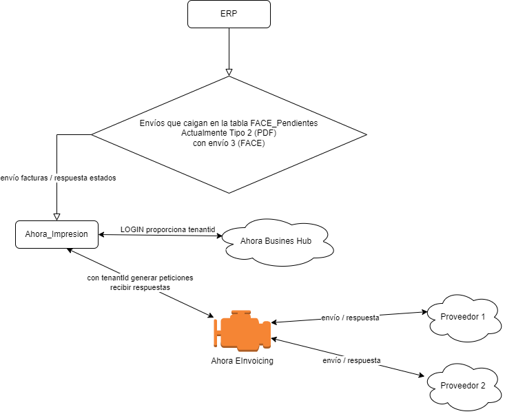 El proceso comienza cuando el ERP detecta envíos pendientes en la tabla FACE_Pendientes, específicamente aquellos de tipo 2 (PDF) con tipo de envío 3 (FACE). Al identificar un envío pendiente, el ERP se comunica con el módulo Ahora_Impresion, el cual realiza un login en Ahora Business Hub para obtener un tenantId. Con este identificador, Ahora_Impresion genera las peticiones necesarias que son enviadas a través del servicio Ahora eInvoicing, encargado de transmitir las facturas electrónicas a los proveedores correspondientes (Proveedor 1 y Proveedor 2) y recibir sus respuestas. Finalmente, el estado de los envíos y las respuestas de los proveedores se devuelven al ERP para su registro y seguimiento.