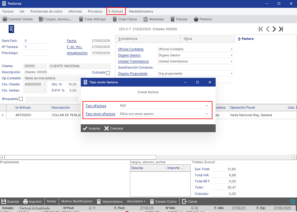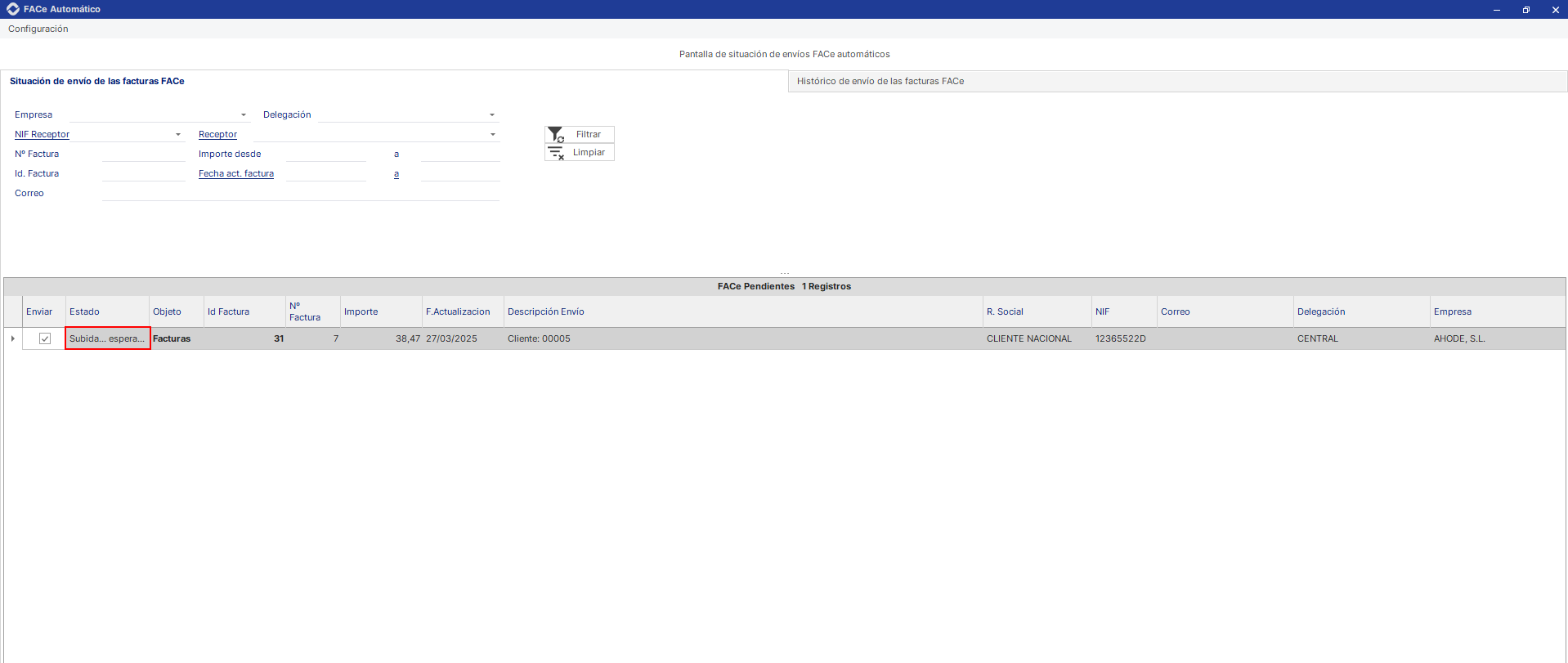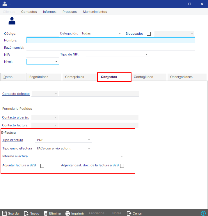 - Únicamente envía lo que llega como PDF en eFacturas_Tipos y dentro de este apartado, el punto FACe con envío autom.. Todo esto lo tenemos que configurar para cada uno de los clientes que queramos que se le envíe a la plataforma. Lo hacemos en la ficha del cliente