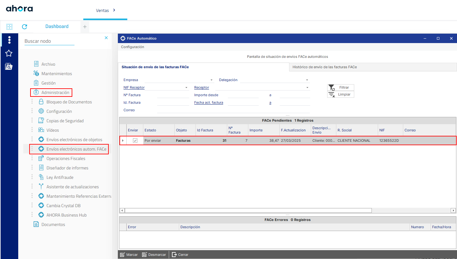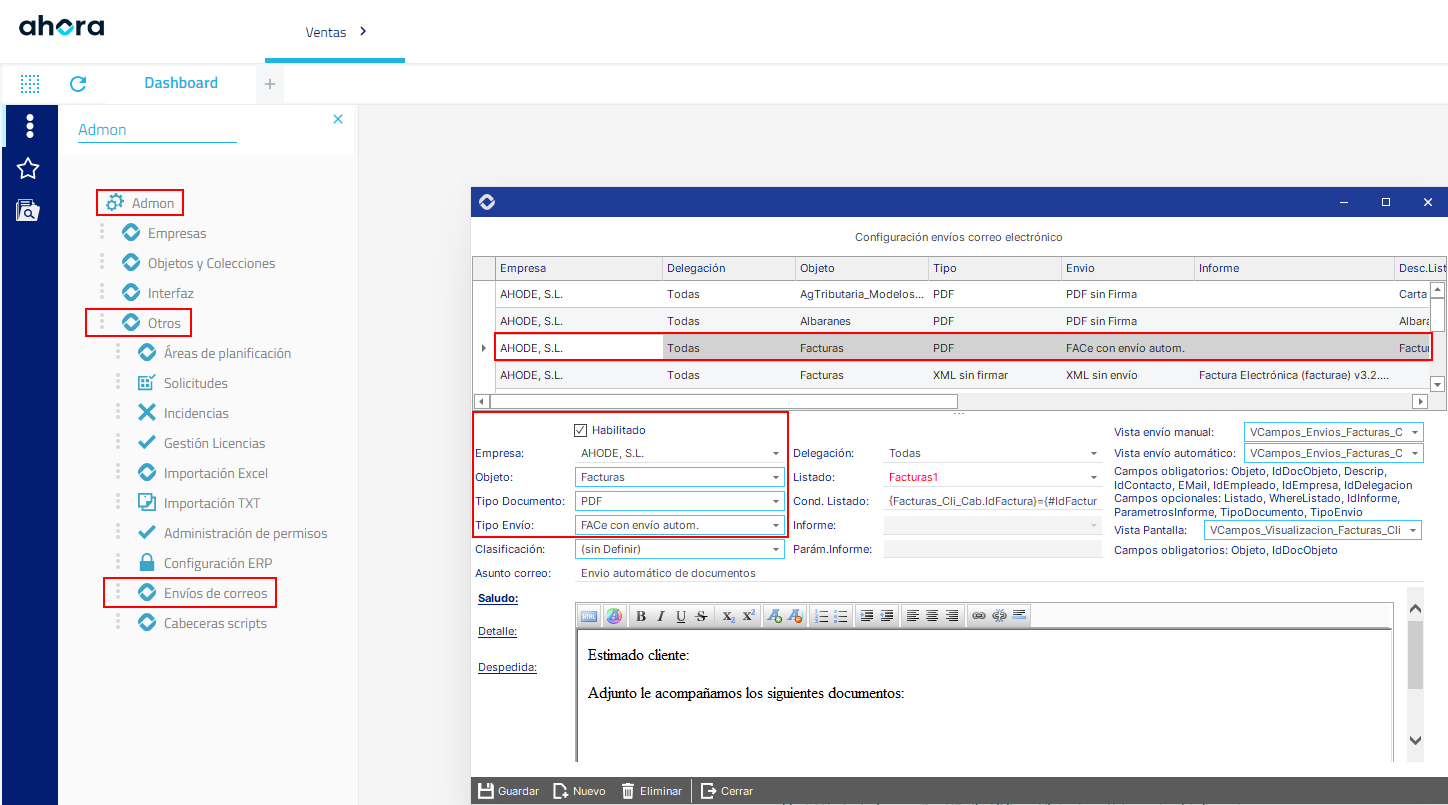 Aquí ya entraríamos a gestionar los envíos como los de la eFactura normales