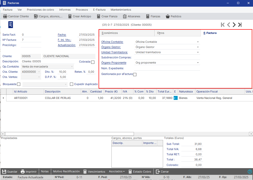 Cuando esté todo configurado correctamente, vamos a generar una factura rellenando los datos de la pestaña e-Factura.