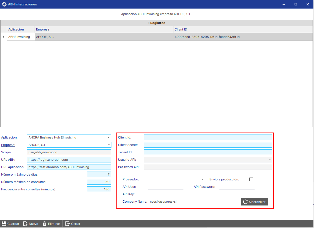 - Los datos que tenemos en la plataforma externa para conectarnos, están ligados a la empresa por lo que tendremos que tener dicha empresa configurada con su NIF correspondiente.