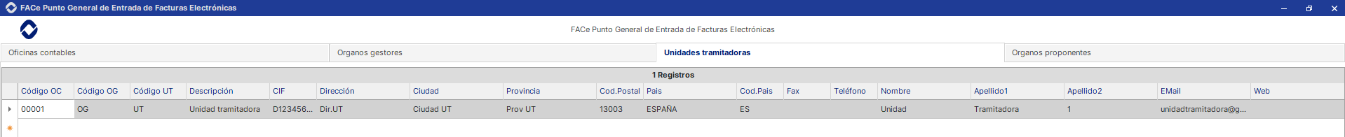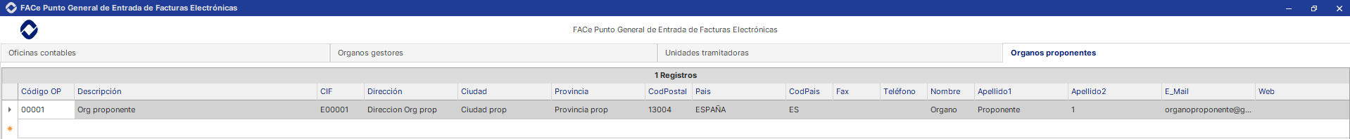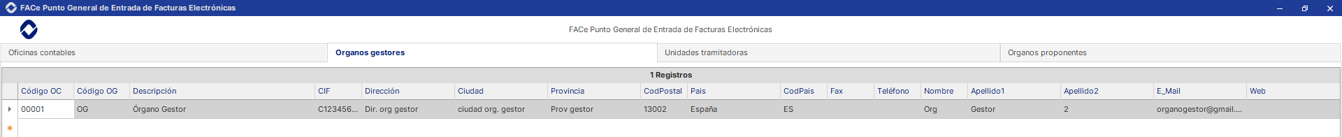 Dentro de Mantenimiento órganos FACe encontramos 4 pestañas que tendremos que rellenar: