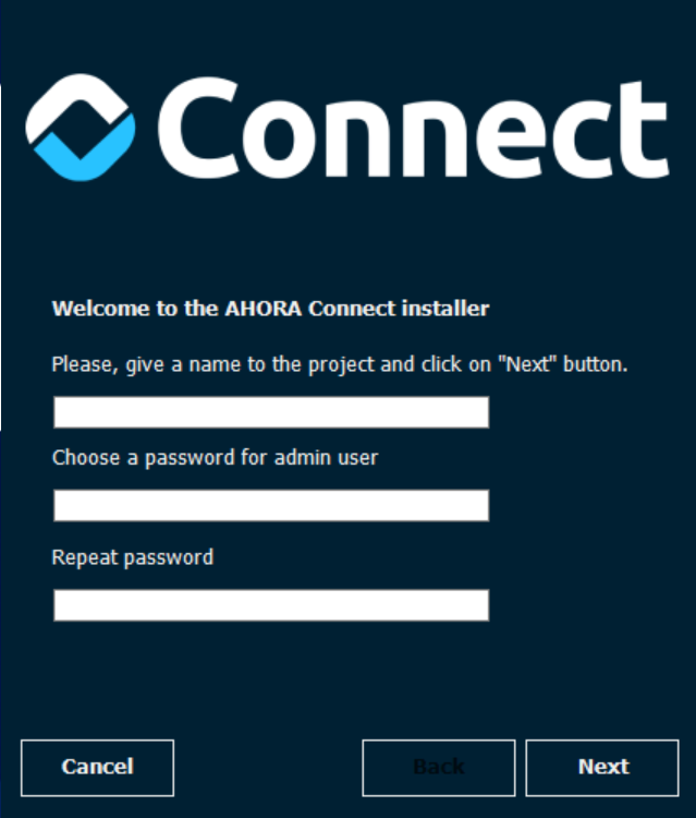 En primer lugar, deberemos indicar un nombre de proyecto y la contraseña del usuario administrador (admin), administrador del sistema que se asociará al IdEmpleado 0 (normalmente el usuario Ahora) de AHORA ERP. Es el usuario con el que podrá acceder a la interfaz de desarrollo para, por ejemplo, poder actualizar la versión.
