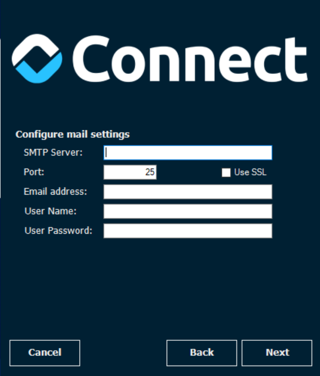 A continuación, nos solicitará la configuración del servidor de correos necesario para el envío del correo de bienvenida. Cuando se generen usuarios nuevos de AHORA Connect, la aplicación da la opción de enviar un email con el nombre de usuario y la validación en dos pasos al email establecido en el usuario.