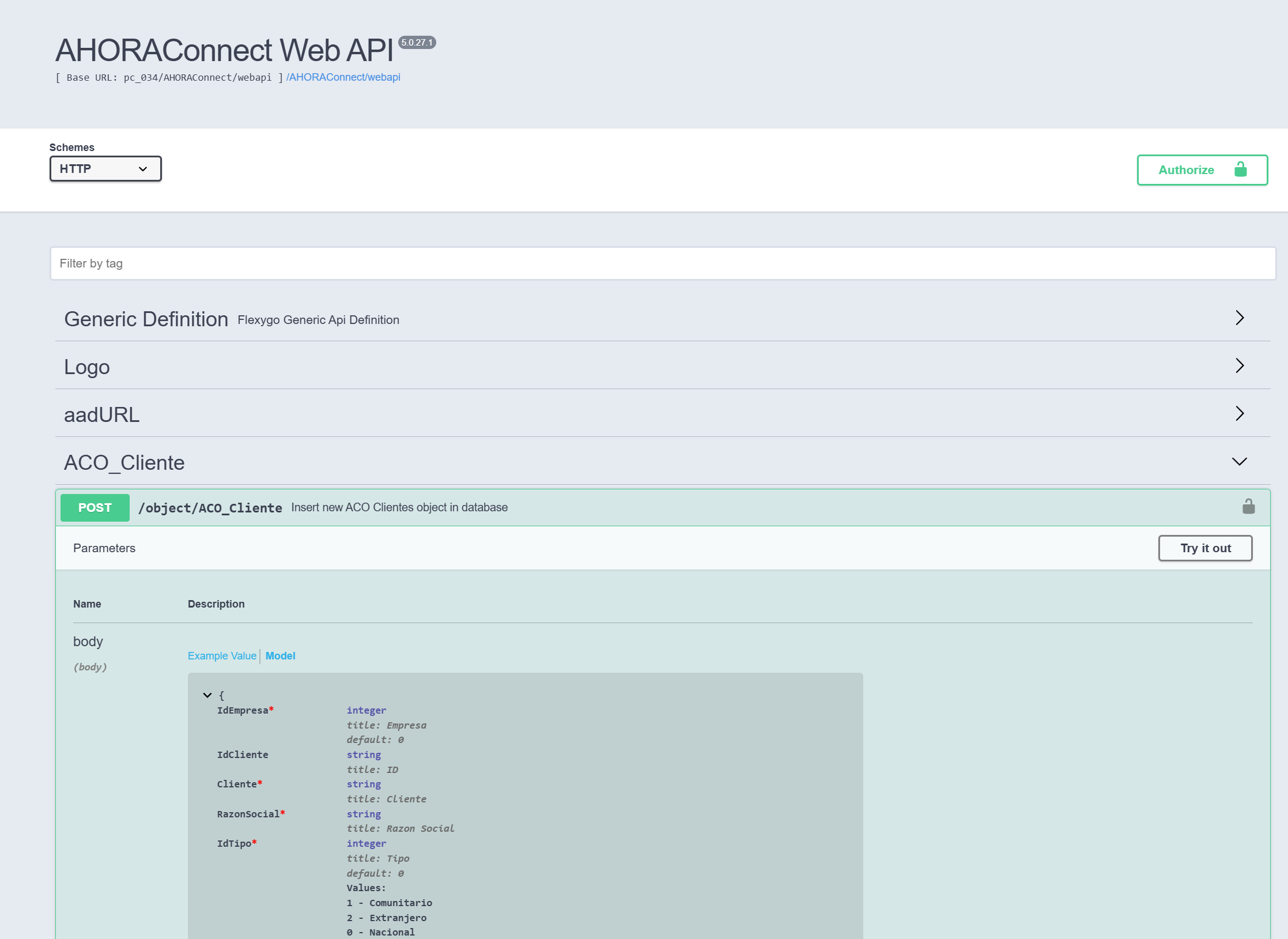AHORA Connect publica automáticamente un Swagger totalmente funcional, que permite:
