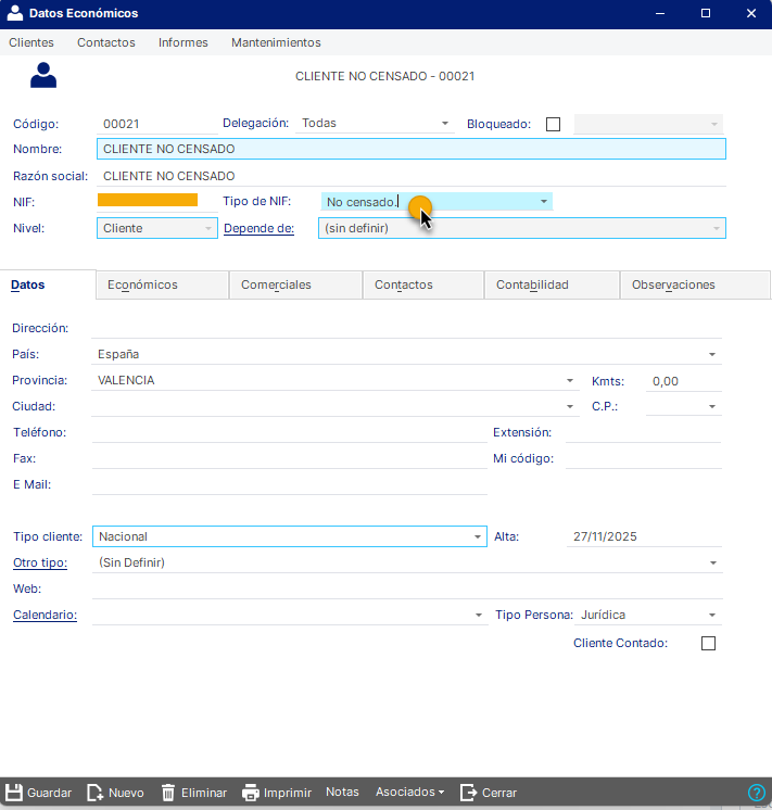 Cuando se emiten facturas a clientes no censados, su configuración será la siguiente: