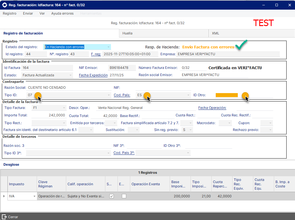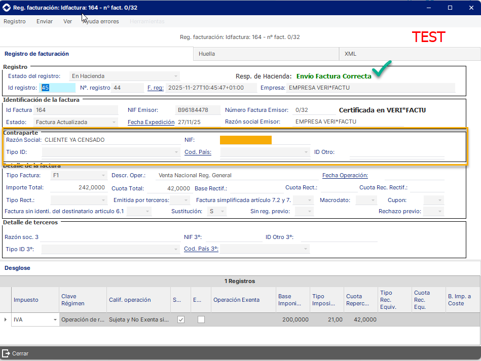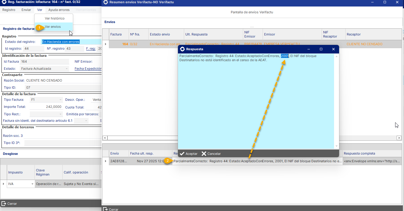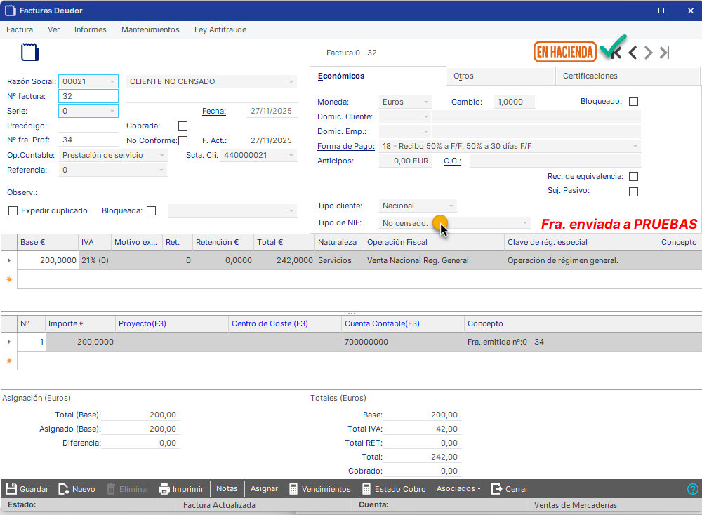 Una vez actualizada la factura de venta al cliente no censado (Tipo NIF 07), la factura se envía a la AEAT con Verifactu y su correcto estado se mostrará como 'En Hacienda con errores'.