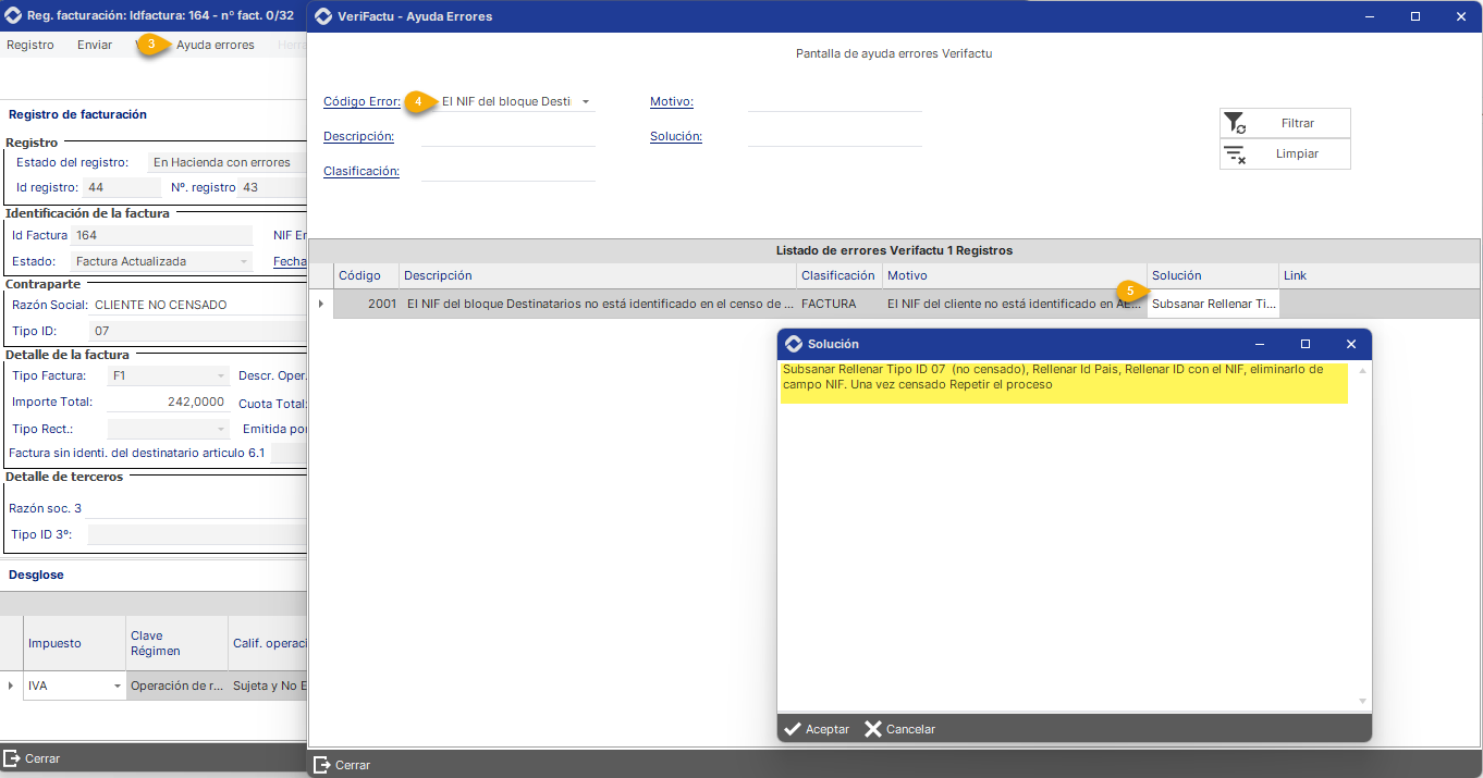 Si el cliente no se ha configurado correctamente, a través de la utilidad de 'Ayuda errores' se podrá consultar el código del error que devuelve AEAT para verificar los pasos a seguir para corregir la situación, tal como se muestra en el ejemplo.