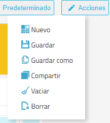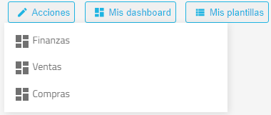 El menú Acciones agrupa distintas operaciones avanzadas relacionadas con el dashboard cargado.