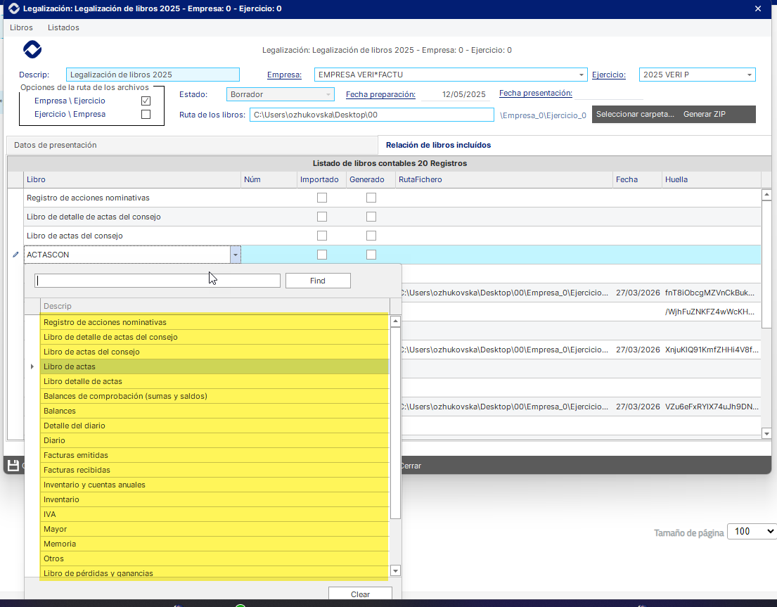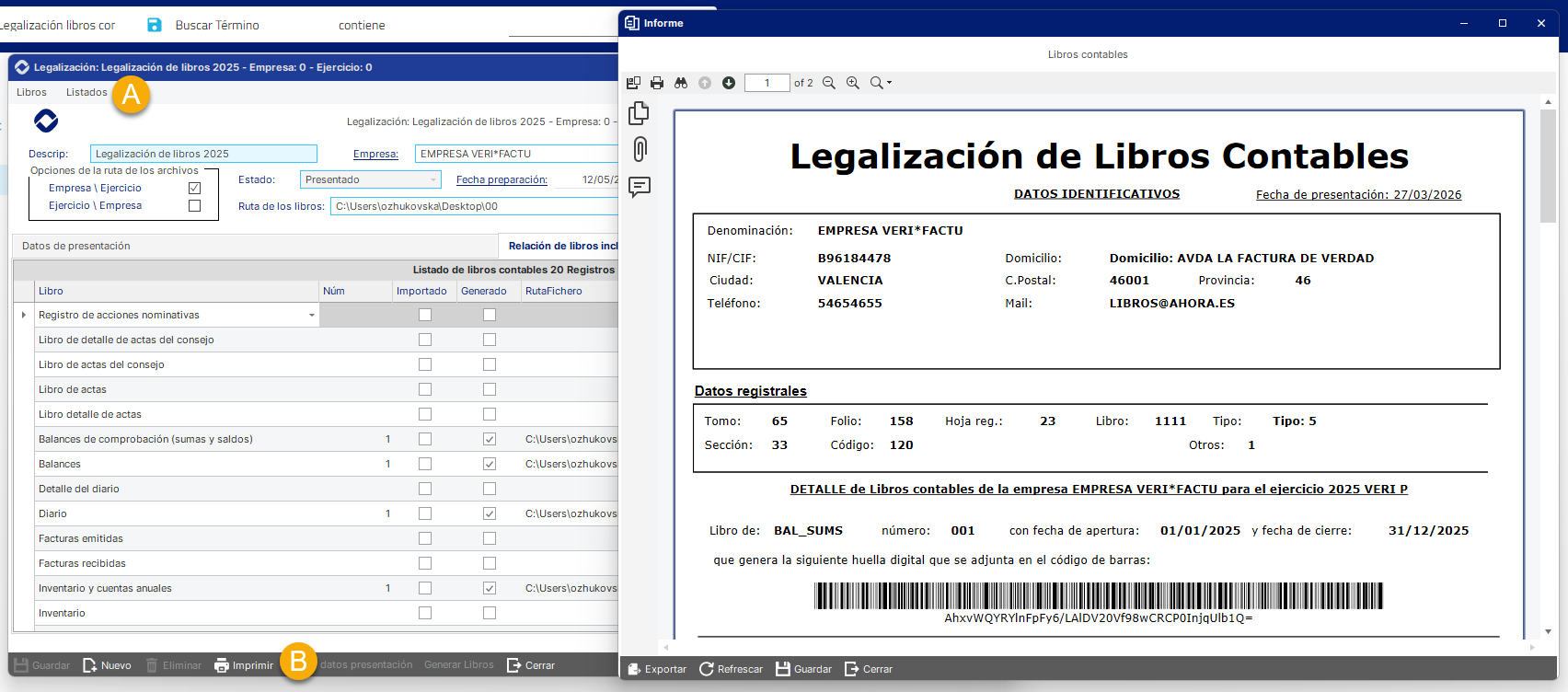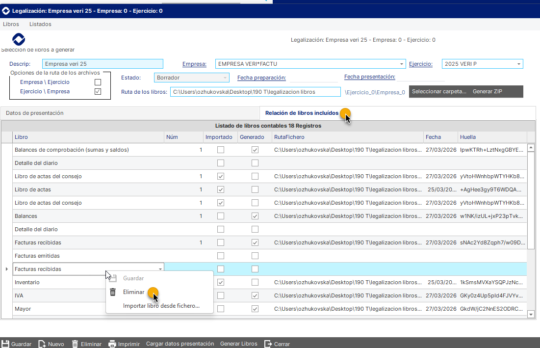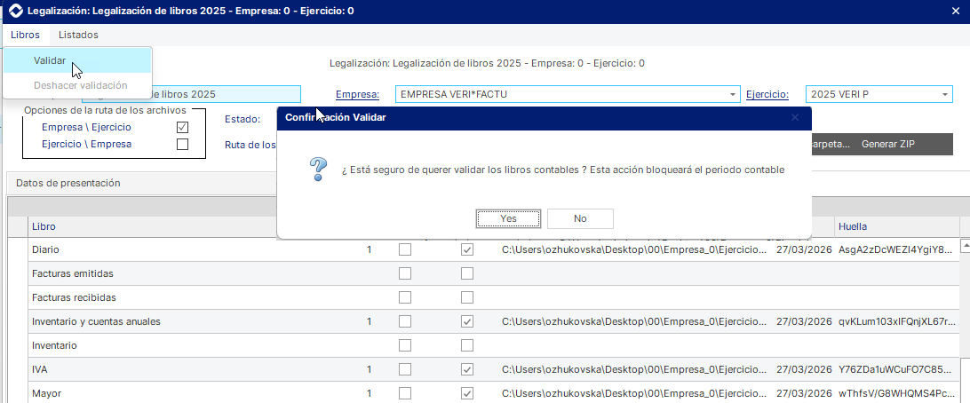 Impresión de los libros: Una vez preparados los libros a legalizar, se genera el listado y se calcula una huella digital (hash criptográfico) sobre los ficheros, siguiendo el mismo principio utilizado de Legalia, lo que permite asegurar la integridad y detectar cualquier modificación posterior.