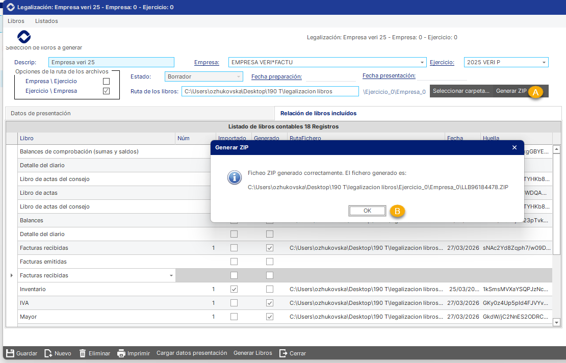 ℹ️ NOTA: La opción Ruta de los archivos permite elegir la organización del ZIP: Empresa\Ejercicio o Ejercicio\Empresa.