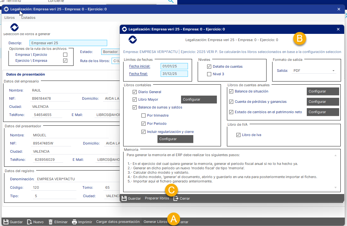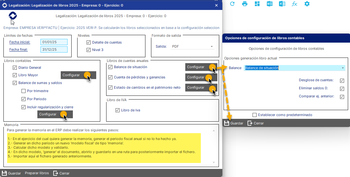 En el proceso de generación de los libros, se ha de Configurar los libros a preparar. Además se deben seguir las indicaciones que se muestran el el formulario para generar la memoria en el ERP.